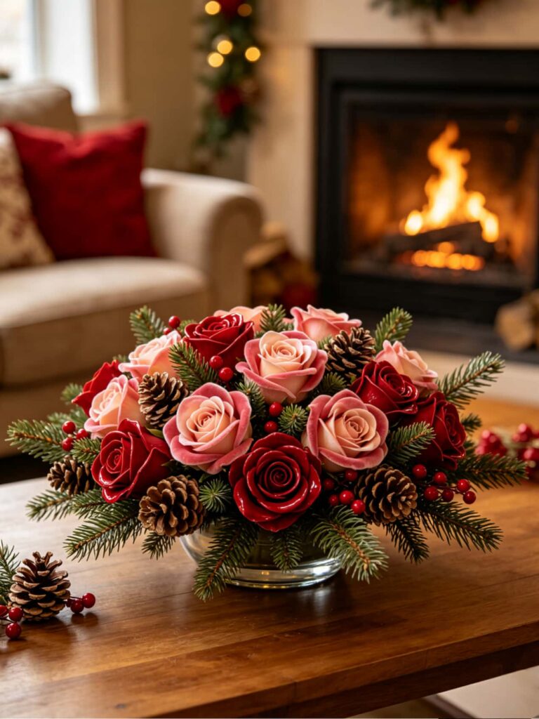 Your coffee table or dining table deserves a centerpiece that feels both festive and cozy. Mix soft blush and deep red roses with frosted eucalyptus and small pine sprigs. Add tiny gold bells or a thin velvet ribbon for an extra special touch. This arrangement pairs beautifully with string lights, throw pillows, and your Christmas tree, creating a space perfect for wrapping gifts, drinking hot cocoa, and spending time with loved ones.