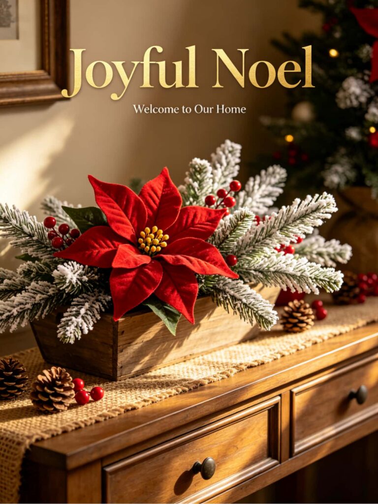 Set a warm, joyful tone for your home with a polished Christmas arrangement on your entryway console. Combine rich red poinsettias, frosted evergreen sprigs, and bright red berry stems in a simple gold or cream vase. The look is classic, full, and instantly festive, welcoming everyone who walks through your door with holiday spirit.